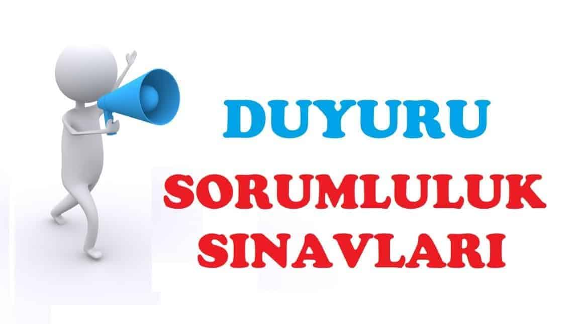2025-2026 Öğretim Yılı 1. Dönem Eylül Dönemi Sorumluluk Sınavları 15-19 Eylül 2025 tarihlerinde yapılacaktır. Öğrencilerimiz, hangi derslerden sorumlu olduklarını E-Okul Veli Bilgilendirme ekranından giriş yaparak öğrenebilirler. Ayrıntılı sınav takvimi, sınavlardan 2 hafta önce okul web sayfasında duyurulacaktır.Sınava girecek tüm öğrencilerimize önemle duyurulur.